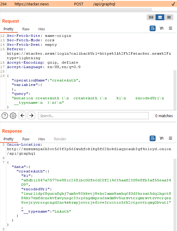 When logging into stacker.news, the website sends a request to its GraphQL database to create a new LNURL-auth, which is returned in the response in JSON. “k1” is the random message, “encodedURL” contains the callback URL to submit the signed message.